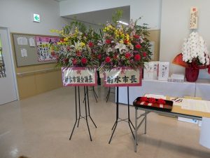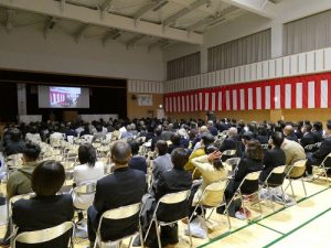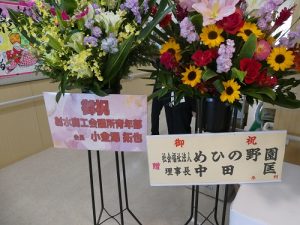 式典ではまず、当法人の分家静男理事長が、「障害者支援と地域との共生を考え、これからも利用者や地域のニーズに応えていきたい」と式辞を述べ、次にご来賓の富山県知事の代理の江尻茂県障害福祉課長様、夏野元志射水市長様、四方正治射水市手つなぐ育成会会長様からご祝辞を頂戴しました。